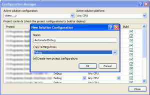 You will get a pop up. Give the config a name eg AutomatedDebug and inherit from debug (my preference). Make sure the âCreate New Project Configâ check box is checked so all the projects get access to this build config.